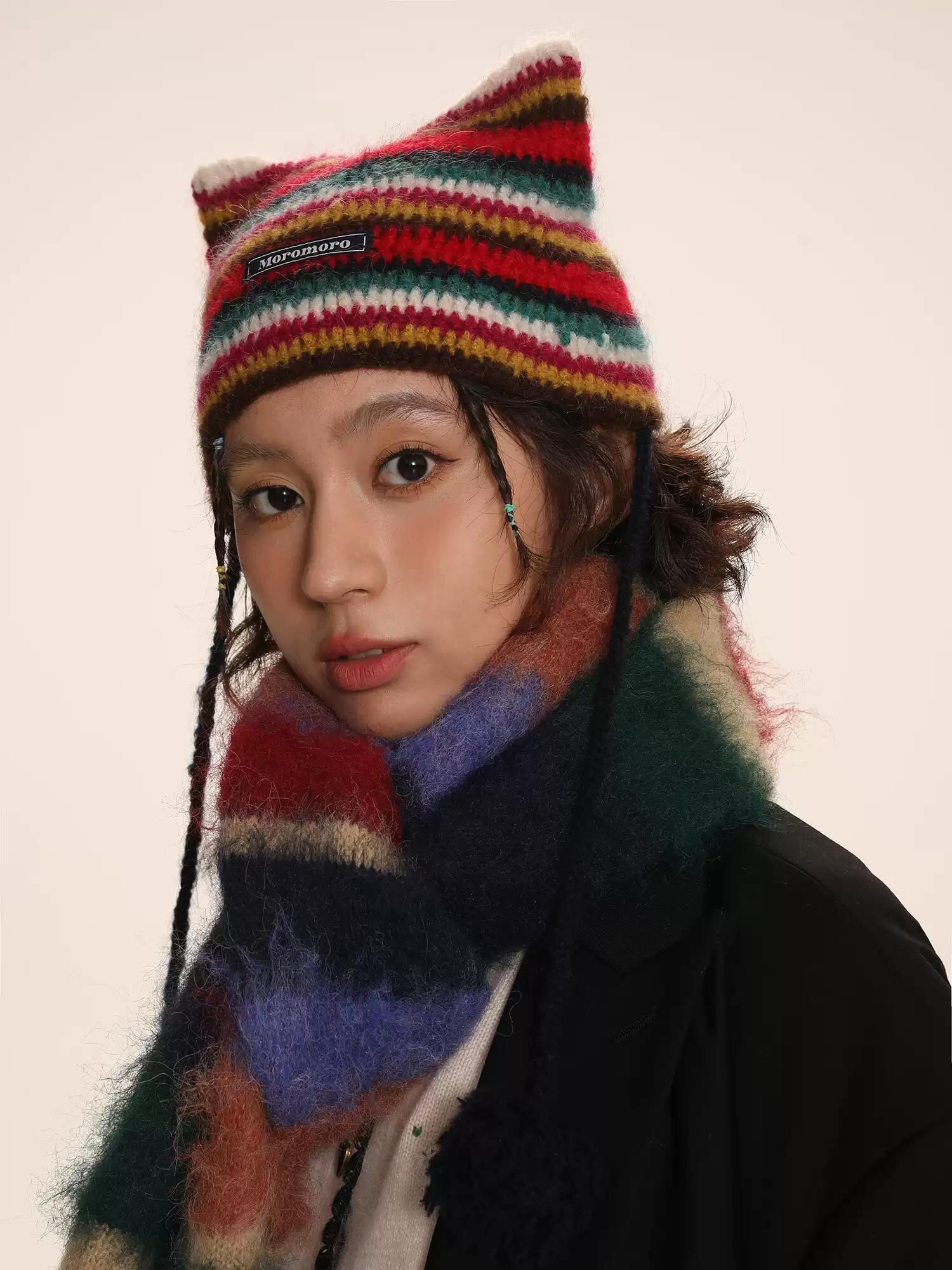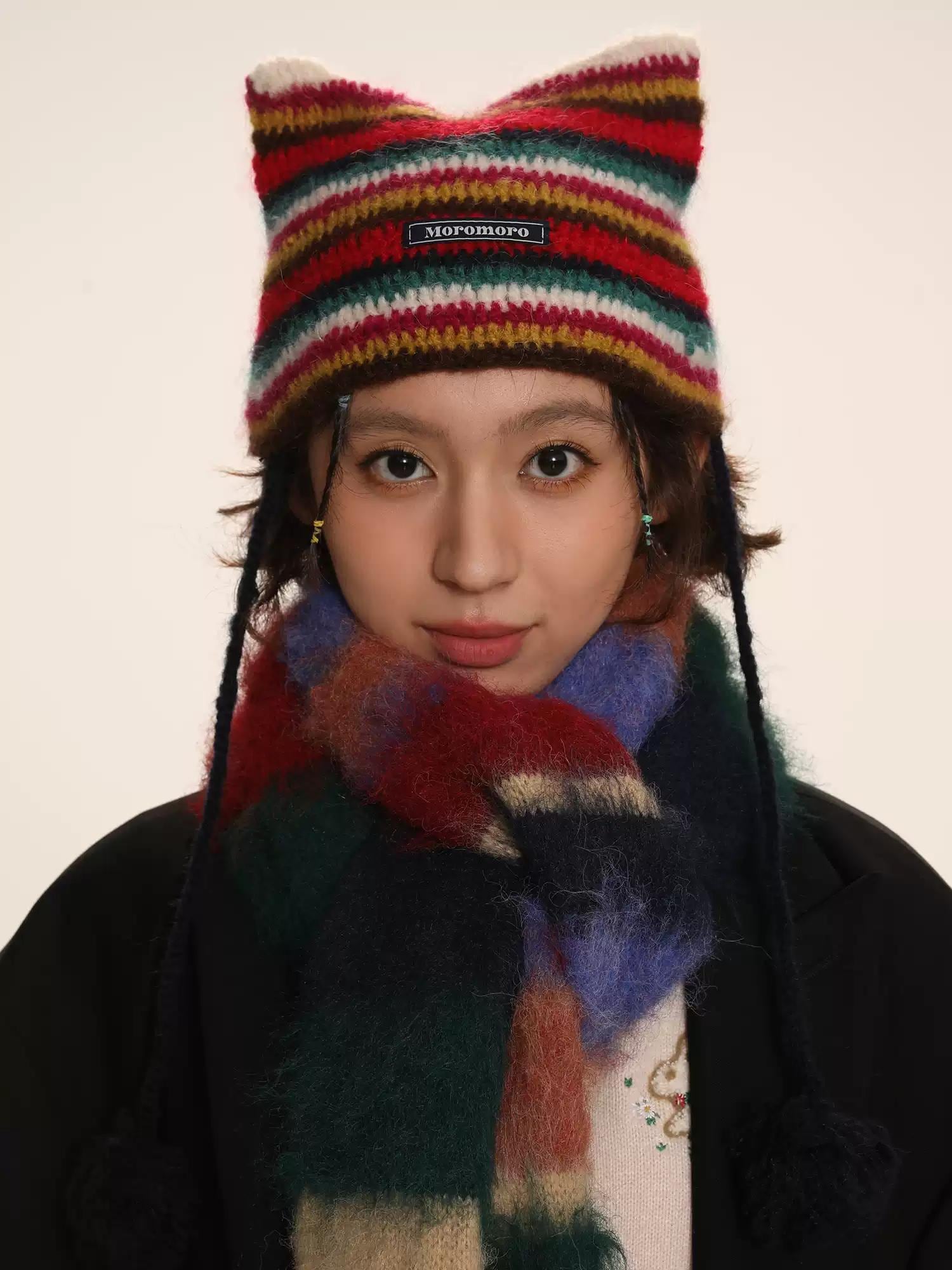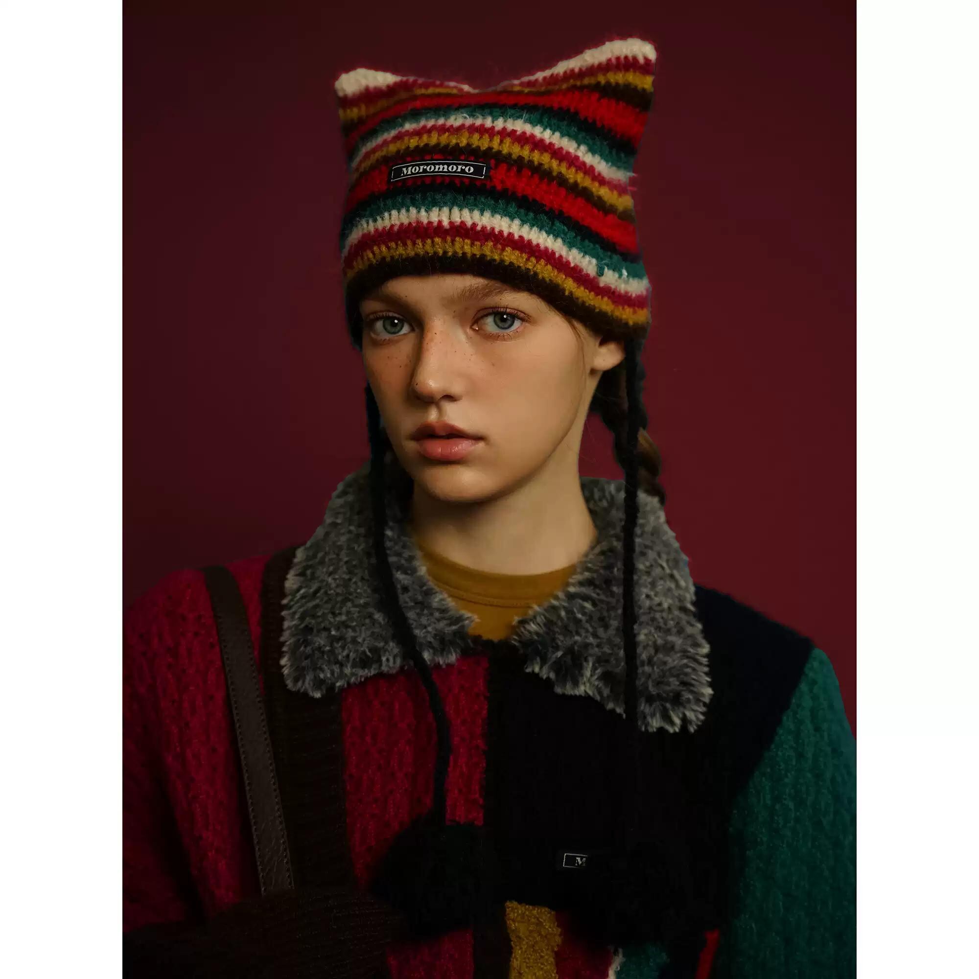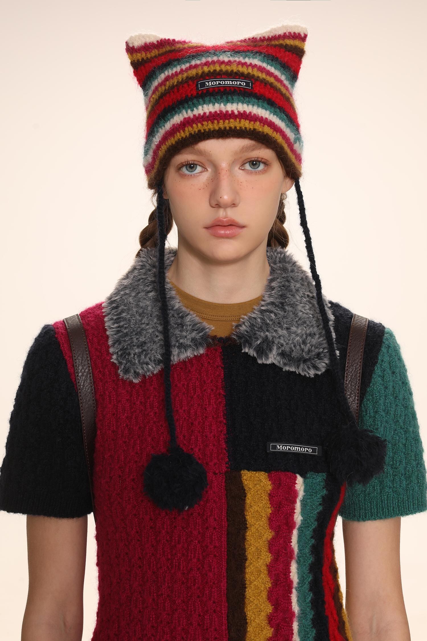 [moromoro2] Cat Ear Pom-pom Striped Hat | creeptrey