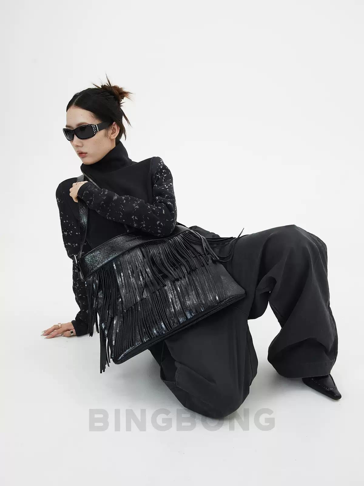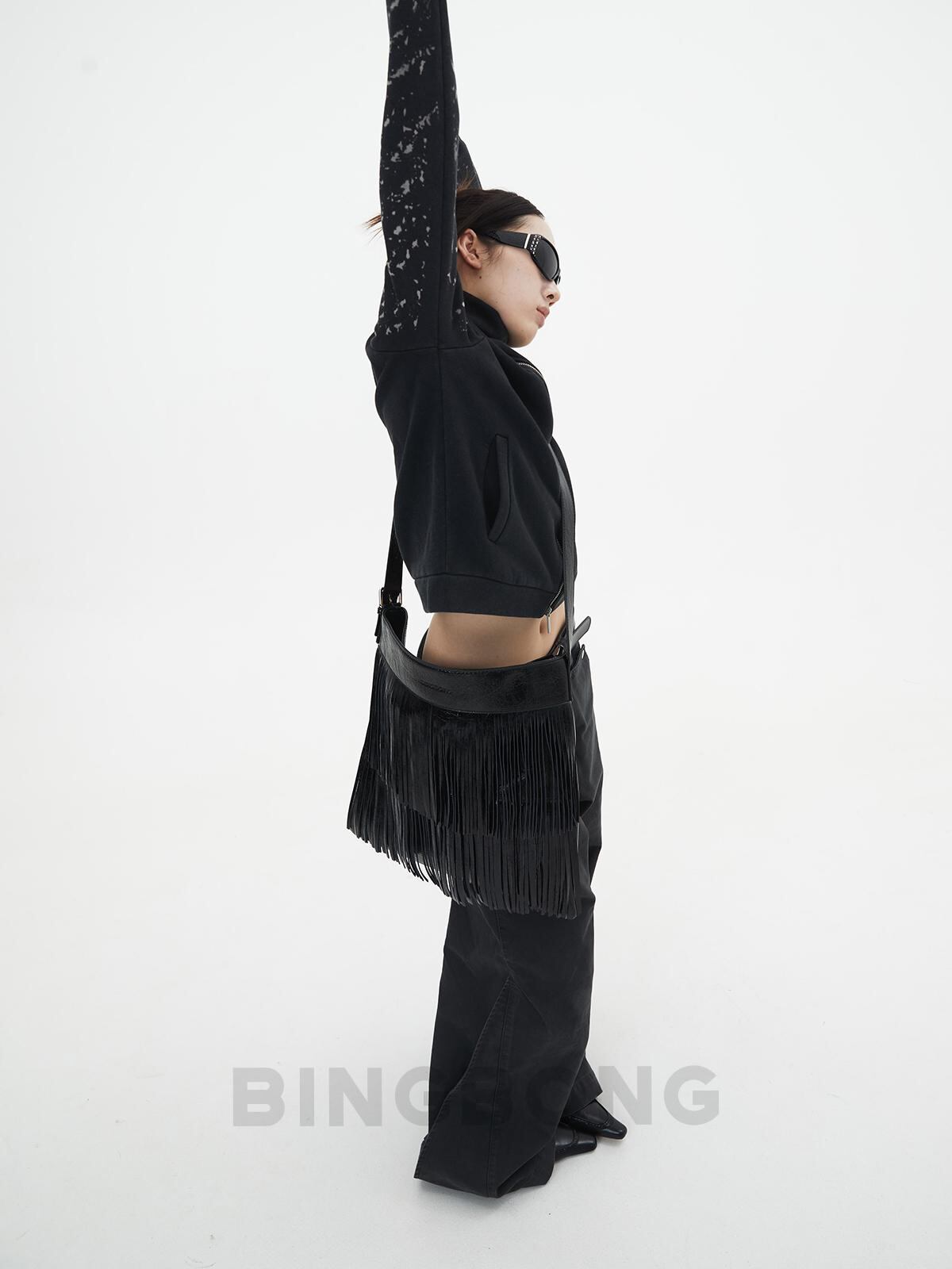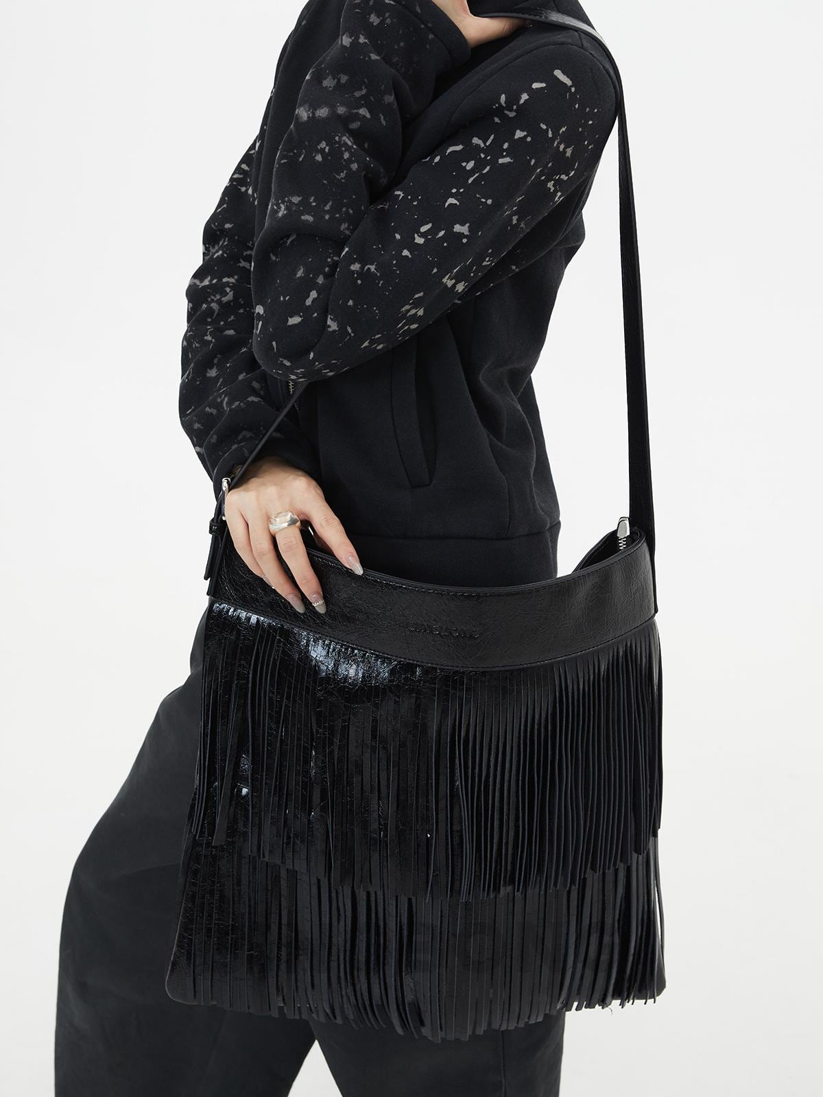 [BINGBONG] Samurai Fringe Distressed Black Hippie Crossbody Bag | creeptrey