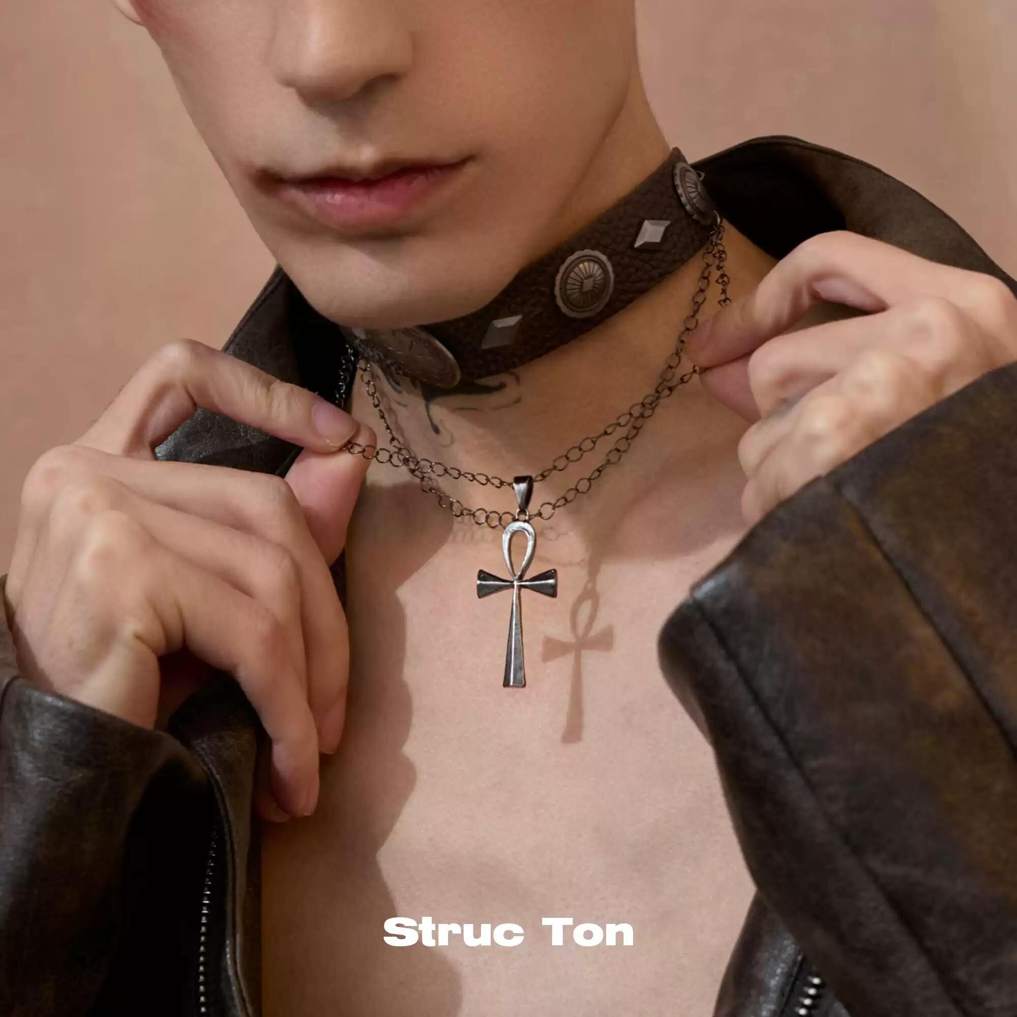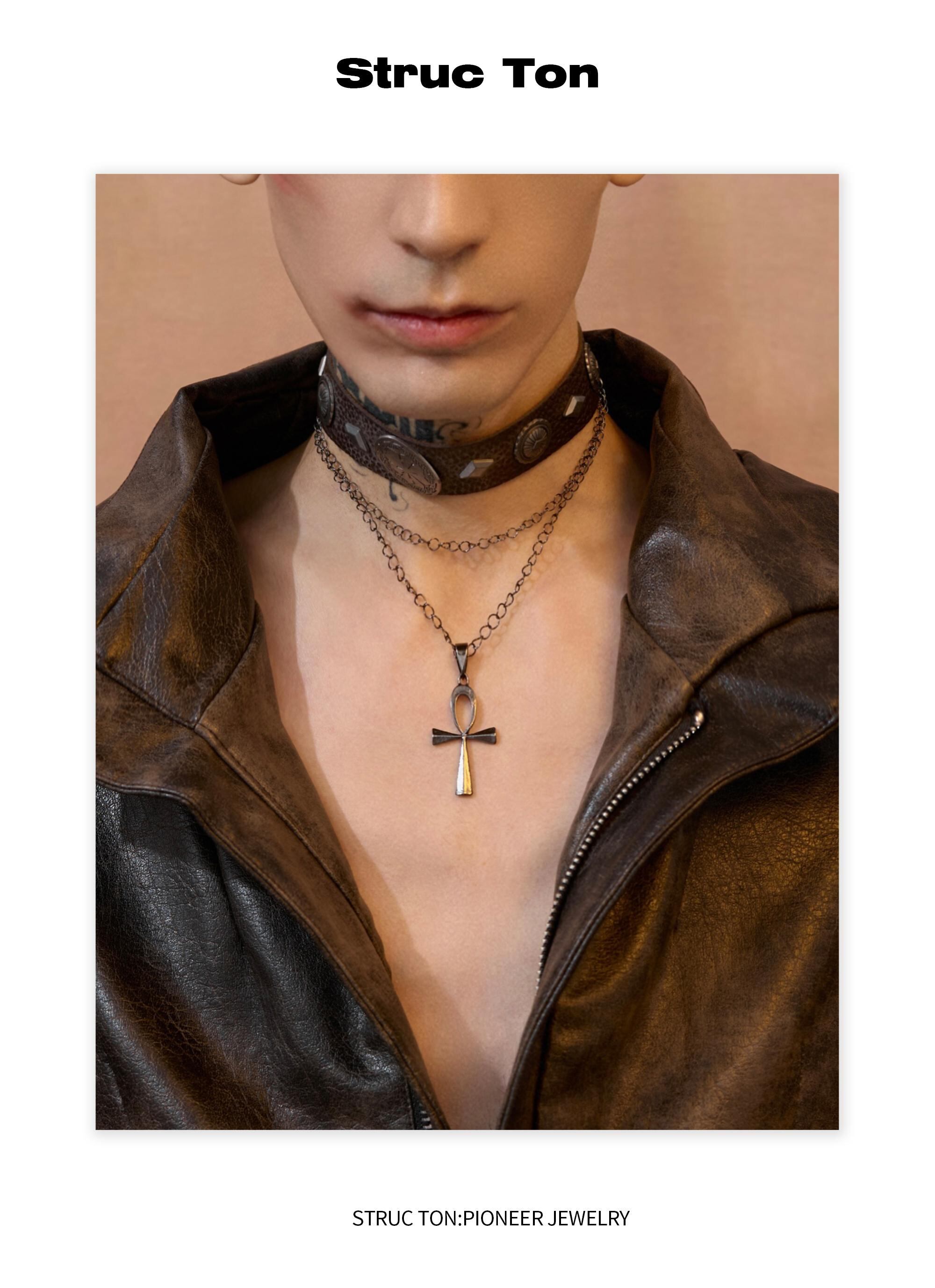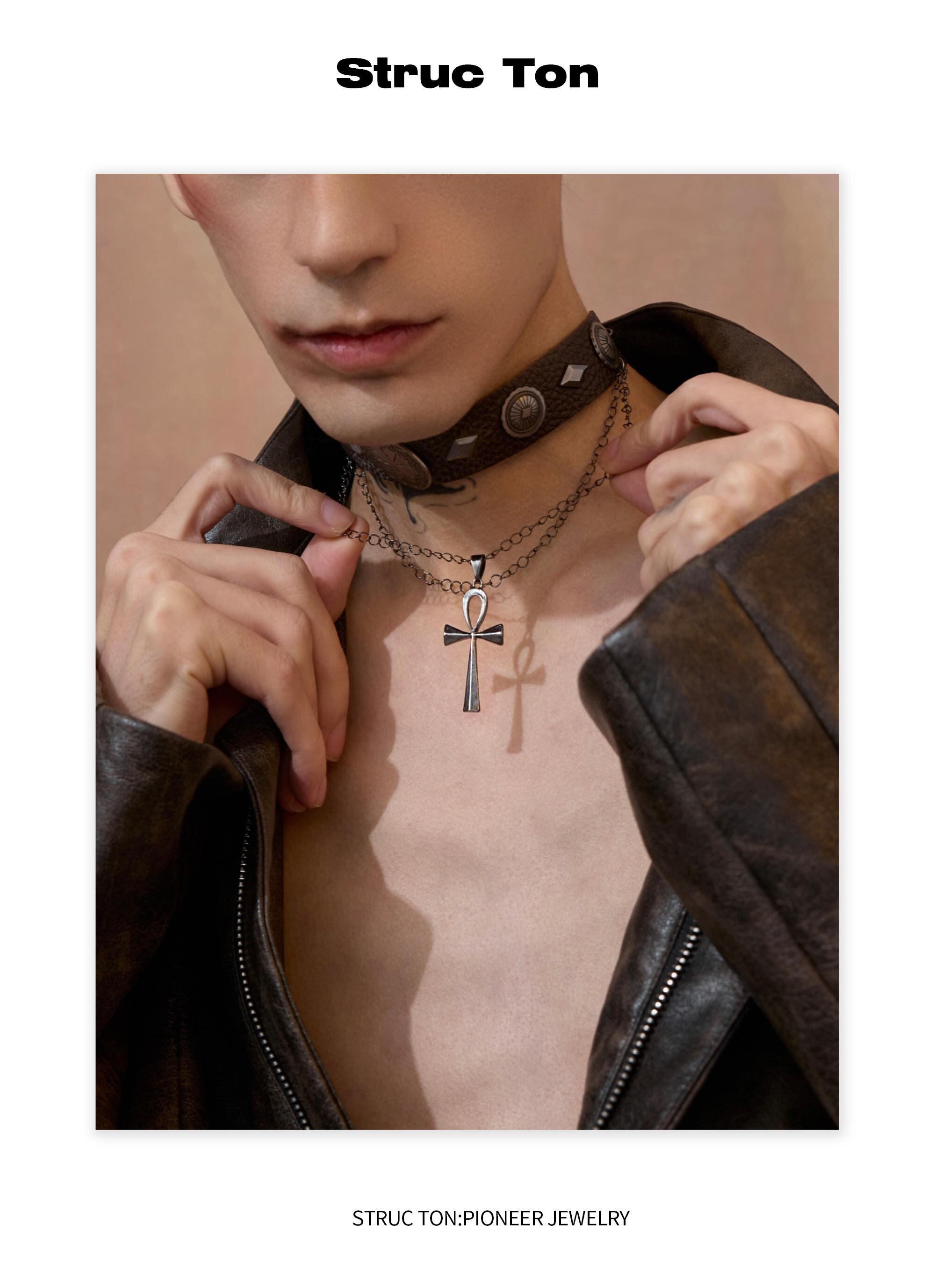 [StrucTon] Brown Leather Roman Cross Punk Necklace | creeptrey